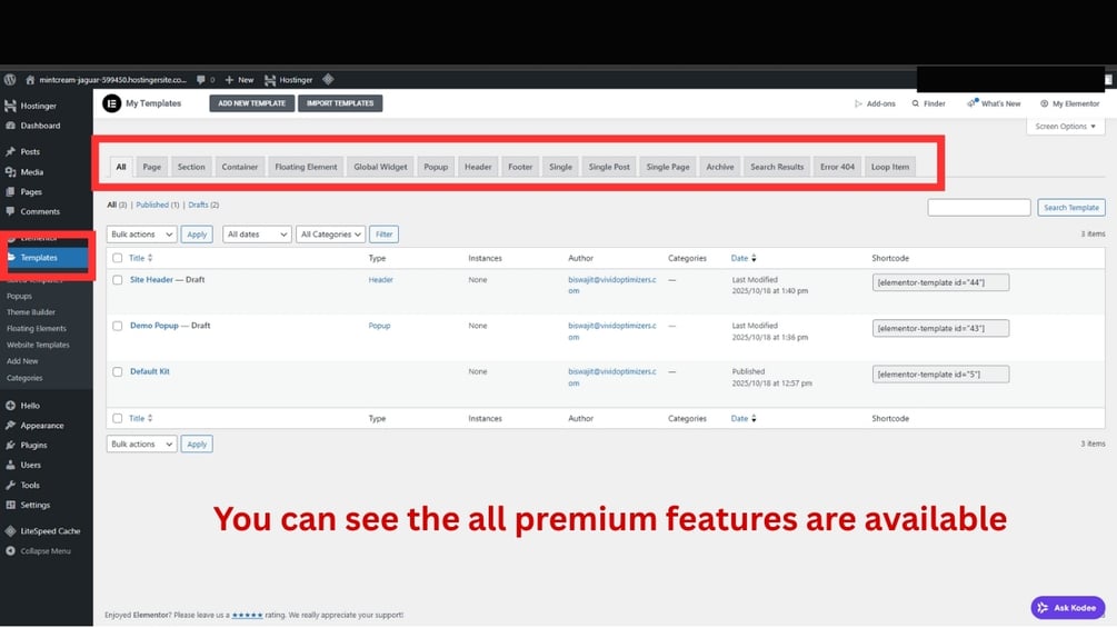 20+ complete Elementor template types, including:
